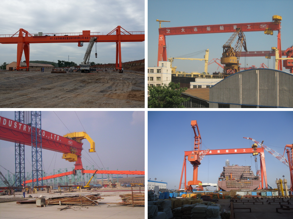 用于船臺(tái)拼裝船體,常備有兩臺(tái)起重小車:一臺(tái)有兩個(gè)主鉤,在橋架上翼緣的軌道上運(yùn)行;另一臺(tái)有一個(gè)主鉤和一個(gè)副鉤,在橋架下翼緣的軌道上運(yùn)行,以便翻轉(zhuǎn)和吊裝大型的船體分段。起重量一般為100~1500噸;跨度達(dá)185米;起升速度為 2~15米/分,還有0.1~0.5米/分的微動(dòng)速度。
